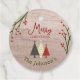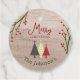 Modern, elegant, cute Nordic wooden personalised Christmas gift tag, with colourful pine trees and red green branches and holly berries.