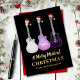 Celebrate the holidays in rock-and-roll style with this personalised family name Christmas card perfect for music lovers and anyone who loves a touch of cool at Christmas. Featuring three pink, purple, and grey pop art semi-acoustic guitars wearing Santa hats, this unique hand-drawn artwork by artist Catherine Sweetman makes a festive statement on a sleek black background.