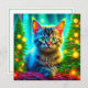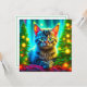 Pretty kitten sitting in front of lit up Christmas trees personalised Christmas card.