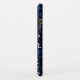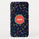This dark navy blue cell case cover has a colourful random zigs and zags type shapes pattern in yellow, red, light pink, teal, and blue. Customise the red and teal green corcle with your name, initials, monogram, or other wording. Make the circle and name as bg or little as you like, or remove it completely.