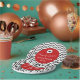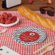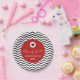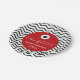 This graduation party plate features black zigzags as the background and a red circle in the centre. Popular hand lettered style text reads: Class of 2017 with custom text for the graduate's name and school. This paper plate is accented with a graduation hat above the text. The red circle colour can be changed to any available colour by choosing the customise it button.