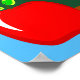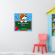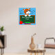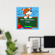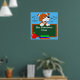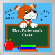 Personalised elementary school classroom poster of a cartoon dog holding a chalkboard printed with name of teacher. Apple and books in front of blackboard. Customise text and background colour.