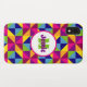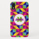 This cell phone case has a colourful pattern of triangles and squares that looks like a quilt in bright yellow, green, pink, blue, burgundy, purple, orange, and white. Customise the white and pink circle with your name, initials, monogram, or other wording. Make the circle and name as big or little as you like, or remove it completely.