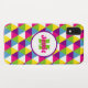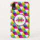 This cell phone case has a colourful pattern of triangles in bright yellow, green, pink, blue, and white. Customise the white and purple circle with your name, initials, monogram, or other wording. Make the circle and name as big or little as you like, or remove it completely.