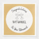 Add these elegant paper napkins to your retirement party table decor. In faux gold and white with black text, the stylish serviettes can be personalised with the newly retired person's name. The greeting on the napkins is 'Congratulations On Your Retirement', with a picture of two champagne glasses.