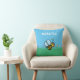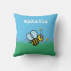 Personalised Cute Bumble Bee in Garden pillow. Black and yellow bumblebee flying on blue sky and green grass background with flowers. Personalise with your child's name in white font. Design and name is printed on both sides of pillow. Perfect for your child's bumblebee, bug, or garden themed bedroom decor or a fun pillow for playroom. This cute little bee is ready to buzz around in a little girls room.