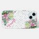 Relax and unwind with this cute floral phone case! A tropical design that embraces the tranquil beauty of nature mixed with a playful edge that is sure to help you relax and have fun every day. A blend of calming green tropical leaves, including banana leaves, palms, monstera leaves, and pink princessa plants, alongside soothing purple-pink orchid flowers and protea bloom, intertwined with various other foliage. Adding an element of fun, a grey 'messy dot' or 'dalmatian dot' background infuses the design with a playful touch. Enhanced by a modern handwritten font, this enchanting print radiates charm and sophistication. This versatile design brings a sense of tropical paradise to any setting or special occasion. Check out all of the coordinating pieces too! Cute Trendy Watercolor Leaves Floral Tropical iPhone 15 Case.