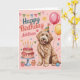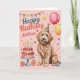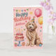 This adorable personalised goldendoodle birthday card design includes a cute watercolor goldendoodle dog graphic, as well as a birthday cake and birthday decorations. The background colour is a light pink. The front of the birthday cards includes a place where you can personalise with your name as well as the words "Happy Birthday". The message on the inside of the card says "Hope your birthday is paws-itively amazing!"