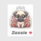 Cute chibi cartoon cosy little pug puppy dog sitting in pink flowers with a name that you can add in the personalise area.