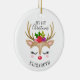 A cute reindeer face decorates this ornament with the words My 1st Christmas and personalised with a name. Fun for a baby girls first Christmas ornament. Designed for you by Blackberry Boulevard.
