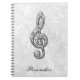 Elegant, glamourous personalised Notebook. Beautiful, dazzling trendy printed image silver and glitter diamonds bling jewels musical note on a chic white floral damask pattern background. A cute, classy, fashionable, stylish, pretty gift for her or any music lover. Women and girls will love this pretty case.