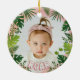 Commemorate your little one's first Christmas with a 'Dino-Mite' keepsake! This double-sided ornament is a beautiful way to celebrate this special milestone. On the front, a watercolor hatching dino with a pink bow and a sweet duckling are surrounded by tropical leaves and the text "My first Christmas". You can personalise it with the baby's name, "Michaela Thomson," and the year. The back of the ornament is designed to showcase a cherished photo of your little one. Below the photo, the playful word "ROAR" is written, perfectly capturing the spirit of your little one's big personality, just like the roaring baby in the placeholder photo! This ornament is a festive and memorable addition to your holiday decor.