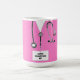 Creative doctor appreciation, birthday or graduation gift mug, featuring pink hospital scrubs and ID tag illustration. To personalise edit text to add name.