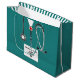 Creative medical school graduation gift bag for doctor graduate featuring hospital scrubs and stethoscope. Edit text to add doctor, physician assistant or nurse's name and medial credentials.