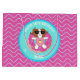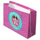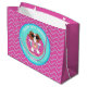This custom birthday gift bag features Sophie, a brown and white cartoon dog, relaxing on a inflatable pool float in the shape of a doughnut. Sophie is wearing sun glasses and is wearing a pink swimsuit with a pineapple design on it. This gift bag has a wavy pattern and illustrated sparkles as accents. The gift bag has tones of aqua, purple, bright pink, white and mint green.