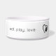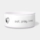 The design has a sleek 'eat, play, love' theme, symbolising the joy of pet ownership. The background features a cool, modern black on white design. Whether they're eating their dog food or drinking water, this durable, high-quality dish makes a delightful pet accessory for any home. It's a thoughtful dog mum or dog dad gift for birthdays, holidays, or any special day.