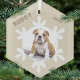 Personalised Dog Pet Name Photo Snowflakes Glass Ornament. You can personalise it with your pet photo, name and year. Insert your favourite dog photo. You can use this custom ornament for any pet. The ornament is in gentle beige colour with a snowflake. Great keepsake for you or a gift for your family and friends.