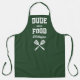The perfect apron for the guy who loves to grill. Two crossed spatulas appear silhouetted in white under the words "Dude with the Food" in white on a dark green background. Personalise it with his name in retro script. Makes an ideal birthday or Father's Day gift.