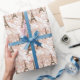 This beautiful Eiffel Tower wrapping paper design features a brown graphic of the Eiffel Tower on a rose gold and white marble background.
