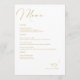 Elevate your wedding reception with our Personalised Elegant Gold Hand Lettered Wedding Menu. This exquisite menu card features a luxurious gold accent hand-lettered script that adds a sophisticated touch to your special day. The design showcases the word "Menu" in a refined thin script at the top left, complemented by a classic gold accent old-style serif typeface for the menu details, ensuring that your curated selections are both readable and elegant.