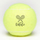 Personalised tennis balls printed with custom name and modern pretty script font and 2 simple tennis racquet.