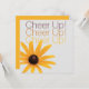 The artwork features a macro photograph of the bright sun yellow petals of a black-eyed Susan flower, which is said to provoke happiness, optimism, and positivity. The flower is presented with elegant typography repeats that read "Cheer Up!" in yellow and wine brown colours. Personalise this cheer up card or purchase as is.