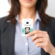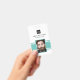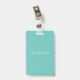Personalised business office ID badge featuring a teal and white background, a photo of the employee, your company logo, name and profession.