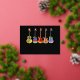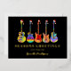 Rock your holiday greetings in style with this personalised music-themed Christmas card featuring a playful lineup of acoustic, electric, and semi-acoustic guitars, each topped with a festive Santa hat. The bold black background paired with shimmering gold foil typography makes the vibrant, psychedelic guitar designs pop, creating a fun and modern twist on traditional holiday cards.