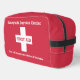 Personalised First Aid Kit tote bag. Daycare, school or family first aid kit perfect to hold medicine, inhalers, epinephrine and first aid items. Customise with the name of the facility or your first or last name. Edit to list the bag's contents or clear the text if you do not wish to personalise it. Large white first aid symbol on a red background. Designs by Lil Allergy Advocates www.lilallergyadvocates.com