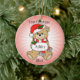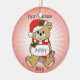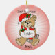 A sweet female teddy bear on a red starburst background with customisable name & date on front and back. Font and colour of text can also be changed.