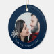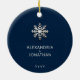 Celebrate a special milestone with this Personalised First Christmas ornament. Cherish your first holiday together as a couple with this exquisite ornament featuring a customisable photo framed by a delicate snowflake on a rich navy blue background. The front elegantly displays 'Our First Christmas' in the lower thirds, capturing the magic of the moment. Turn it around to find the snowflake-adorned back, ready to be personalised with your names and the memorable year. This unique ornament is a perfect addition to your tree and a wonderful keepsake to mark your journey together.