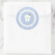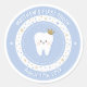 Personalised First Tooth party decorations. Baby blue sticker with cute tooth, editable name and milestone date. Visit the shop to see all the First Tooth collection.