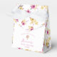 Personalised Floral Pattern Hot Air Balloon Favour Boxes.   An all-over watercolor floral print in pink and gold.  FRONT:   A small hot air balloon.  Personalise the template with your message, name, event title, and date.   © Kimbellished, LLC