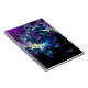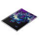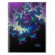 Personalised Fractal Music Clef Journal Notebook. Purple, blue, teal, and gold with black monogrammed notebook with dark and colourful music treble clefs blended into the design and a larger violet music clef accenting the fractal. Fill in your name and initial at the prompt to personalise and customise anyway you like.