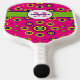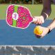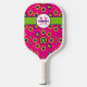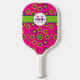 You'll be all the rage on the pickleball court when you're sporting one of these personalised funky circles pickleball paddle with monogram in bright coloured circles with rings around them in colours of neon green, yellow, burgundy, and navy blue on a hot pink background with a neon green and navy band across the top with a white and burgundy circle overlay that is personalised with your name and monogram in navy and pink. Email niteowlstudio@gmail.com with any request for changes.