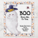 Festive Halloween wine label featuring a smiling ghost in a witch hat with the phrase “Boo from me to you.” Surrounded by a playful border of pumpkins, bats, and autumn leaves, this design is fully customisable with your family name or party message. A fun way to dress up bottles for Halloween parties, hostess gifts, or seasonal celebrations.