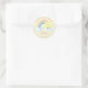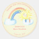 Personalised Girls Rainbow Sunshine Classic Round Sticker are the finishing touch for your Sunshine themed baby shower. Tags have mother's name, baby shower, and the date. All on a textured yellow background.