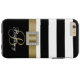 This preppy monogrammed design is made up of a bold black and white horizontal striped pattern, a PRINTED gold sating ribbon with a square diamond brooch and a black bottom portion you can personalise with your name and your monogram initial in gorgeous script fonts. Be stylish, cool, sophisticated and girly all at the same time. For her. the fashionista that follows the latest trends. Design by Elke Clarke©. Graphics licensed for use.