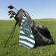 Perfect for dads, retirees or anyone who loves golf, this personalised golf towel in rich hunter green and white stripes features a golf ball & clubs logo that can be customised with his name, birth year, retirement year or special year.