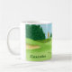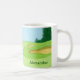 A flag casts a shadow across a putting green, with sand trap, fairway, and trees in the background in this watercolor painting. Personalise with the name of your choice, which will appear at the bottom left and bottom right in an elegant, green font. Makes a great gift for any golfer.