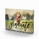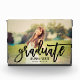 A striking graduation photo block featuring a full senior portrait with Graduate in bold black brushed script across the design and the graduate's name and class year in clean serif type. The high-contrast script creates a modern, statement keepsake. Customise with a favourite portrait and details for a personalised graduation gift or desk display.