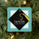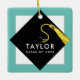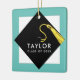 Graduation memento gift and Christmas ornament featuring classic black graduation cap and gold tassel design on teal blue background. To personalise edit text to add graduate's name and the senior class year.