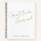 This stylish blank lined gratitude journal has a modern minimalist style with gold text on a simple white background. Personalise it with your name. Great gift idea.