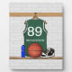 Personalised Green and white basketball jersey hanging in a locker room with a basketball , basketball sneakers and a drinks bottle. The jersey is customisable with your own numbers and name, to create a truly unique gift for the Basketball player or basketball fan. If you require a different colour combination contact us via the store. sgb01