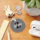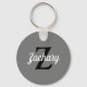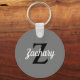 This personalised keychain features a black monogram and white retro script name on a grey background.