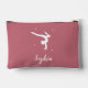 This personalised pink gymnastics accessory pouch features the silhouette of a gymnast alongside your custom name in elegant script typography. Perfect for girls who love tumbling, as a make up, travel bag or for dance lessons. Personalise it with your name and utilise the editing tool to adjust the font size to fit perfectly.