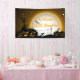 Personalised Halloween party banner. Features a black cat, full moon, and jack-o-lantern pumpkins in a scary graveyard scene. Colours are orange and black.