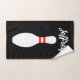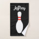 Personalised hand towel for bowling fans. Custom name with classic bowling pin drawing.