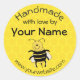 This customisable round vinyl sticker has an image of a cute cartoon honeybee on a honeycomb background.
