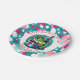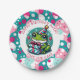 Cute personalised birthday party paper plates for a little girl's birthday. An adorable frog in a birthday hat holding a gift with a cute polka dot background in pink and teal. Add name in personalise area.